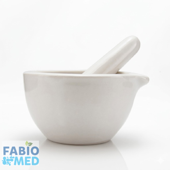 Le mortier est un instrument de laboratoire utilisé pour broyer, pulvériser ou mélanger des substances solides à l’aide d’un pilon. Il est fabriqué en porcelaine épaisse, un matériau choisi pour sa grande dureté et sa résistance à l’usure. Il possède des parois arrondies, un petit fond plat pour assurer la stabilité sur le plan de travail et un bec verseur. L’extérieur est émaillé (lisse et brillant) pour faciliter le nettoyage, tandis que l’intérieur est laissé dépoli (rugueux) pour maximiser l’efficacité de la friction.